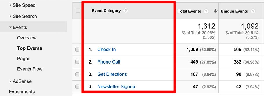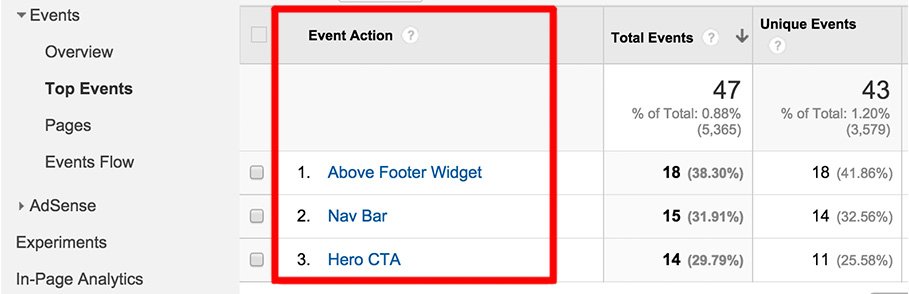 When you look at your Top Events Report in Google Analytics, the Category is the first item that appears. You can then drill down further into each Category and view the Action and Label values. Because it’s the very first thing you see in the report, it makes sense to name Categories something that broadly describes each event you’re tracking. If you’re tracking signups to a newsletter as a KPI, for example, name the Category “Newsletter Signup”. This way, you can quickly get to the data you’re looking for.