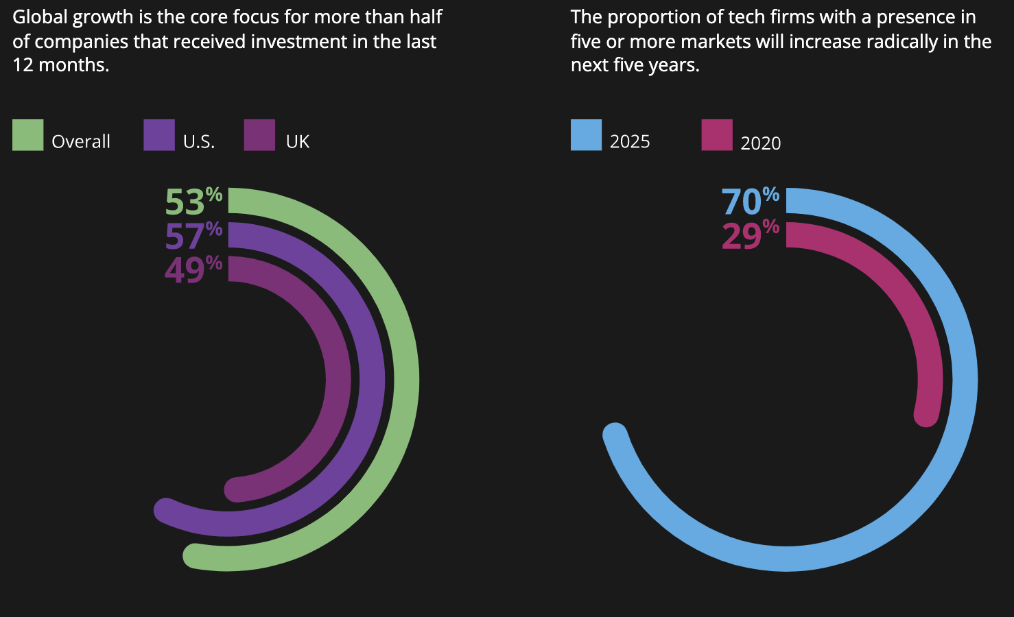 According to Velocity Global, global growth is the core focus for more than half of the companies that received an investment in 2020, with 70% of tech companies, in particular, planning to have a presence in five or more countries by 2025.