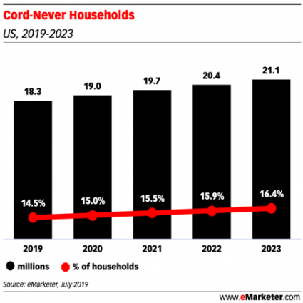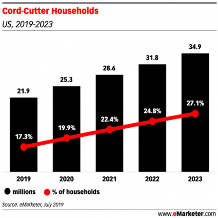 In 2020, more than a third of all US households are either cord-cutters or cord-nevers (viewers who never had a cable subscription to begin with). 88% of those who still watch traditional TV use a second device at the same time, providing a distraction from commercials that limits true brand connections. And viewers who watch TV with DVR can skip commercials entirely.
