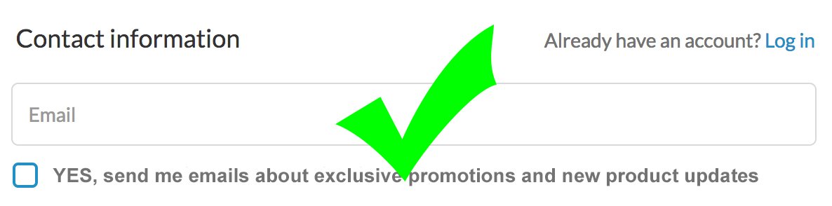 - DON’T Pre-Check Boxes: Opt-in check boxes should not be pre-checked. Also, don’t forget to include check boxes at every point of email collection, even including Account Creation and Cart Checkout.