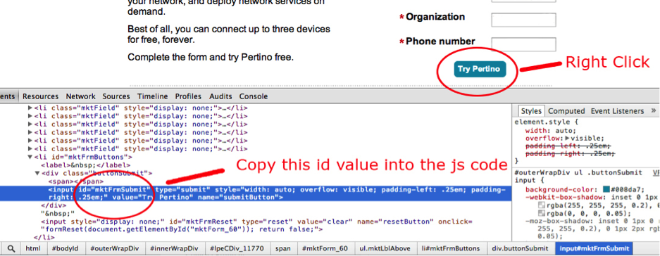 In the code of the button, you should be able to find the id of the form fairly easily. In our case it was called “#mktFrmSubmit”. Make a note of this in order to add it to the JavaScript code.