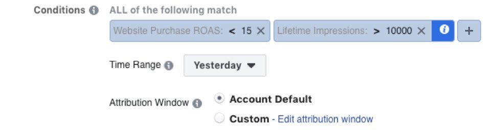 Next up is the Condition by which the rule above will be judged. There are over 50 different conditions to choose from and with each having many different combinations on top of one another, there are literally thousands of possible conditions to trigger your rules on. We are keeping it simple here and telling Facebook and Instagram to look for ad sets with Lifetime Impressions of over 10,000 with an ROAS of 15+ yesterday. If the conditions are met, the rule above will fire and your budgets will be increased by 10%. You can expand your lookback window for your conditions by choosing a different Time Range (last 2 days, last 7 days, etc.), and base your ROAS off your Attribution Window as well. A lot of this is based on what you want to look at and how far back you wish to look.